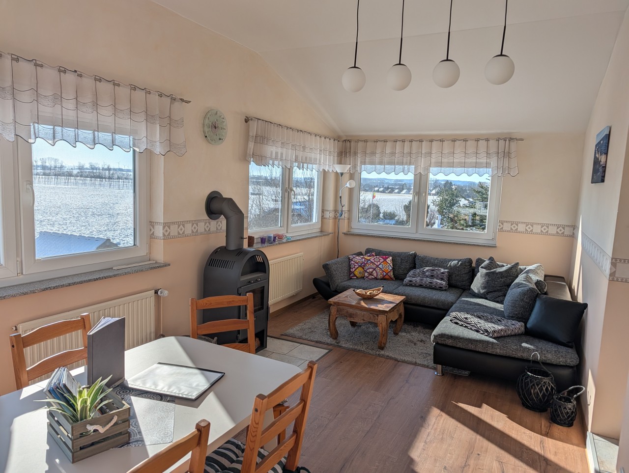 Behagliche Ferienwohnung im ersten Stock an der Ostsee auf der Halbinsel Hohen-Wieschendorf , mit 100 qm Wohnfläche, Blick zur Ostsee und ins Grüne, geräumig und optimal geeignet für 5 Erwachsene und ein Kind.